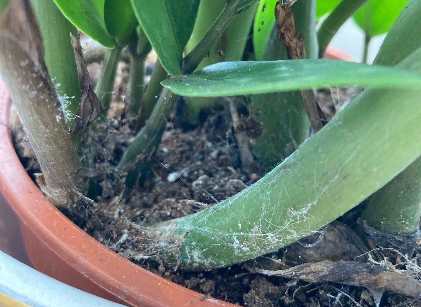 - Паутинный клещ – это очень мелкий красный паучок. Поселяется на обратной стороне листьев. Вы его обнаружите по тонким белым паутинкам в этих местах. Обмойте растение под струей теплого душа в ванной, особенно обратные стороны листиков. Большую часть насекомых вы обязательно смоете. Чтобы наверняка избавиться от всех особей и их личинок и яиц, обработайте растение готовыми системными инсектицидами.