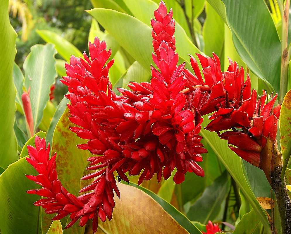 Она же «красный имбирь». Высота до 2 м. Листья очень длинные: вплоть до 80 см. Цветочки небольшие, белые. Наибольшую ценность несут прицветники насыщенного красного (редко белого или розового) цвета.