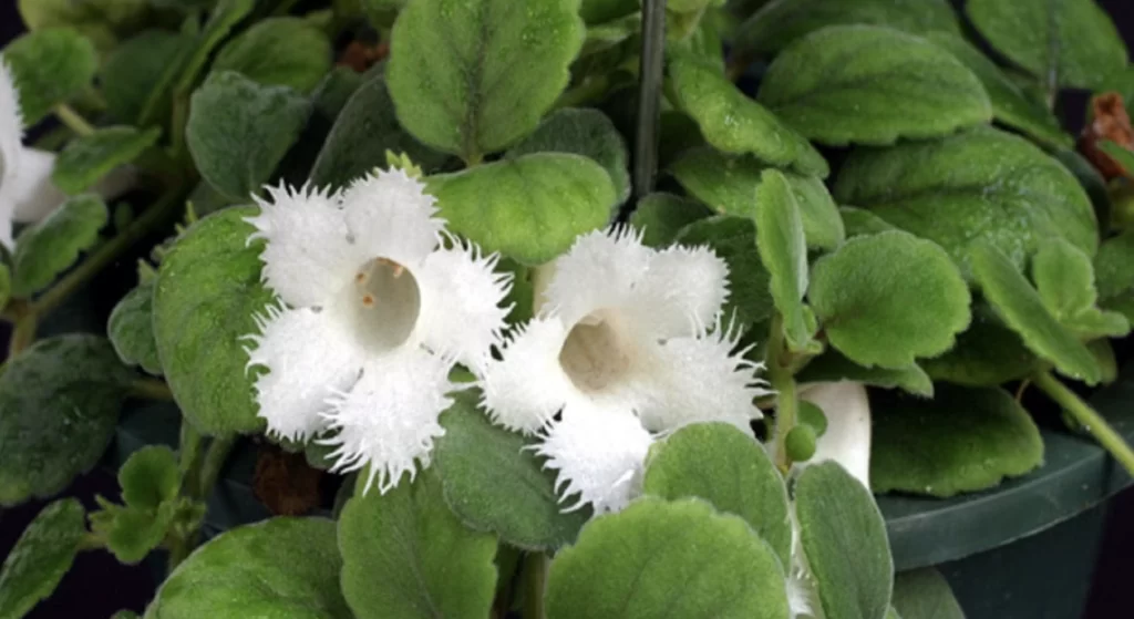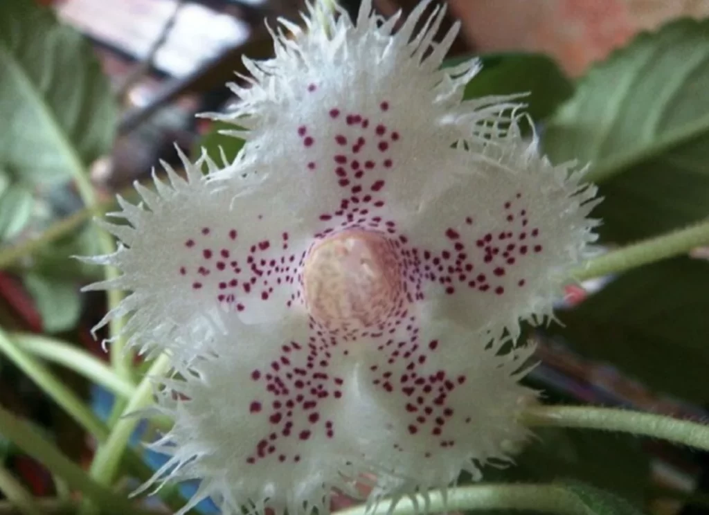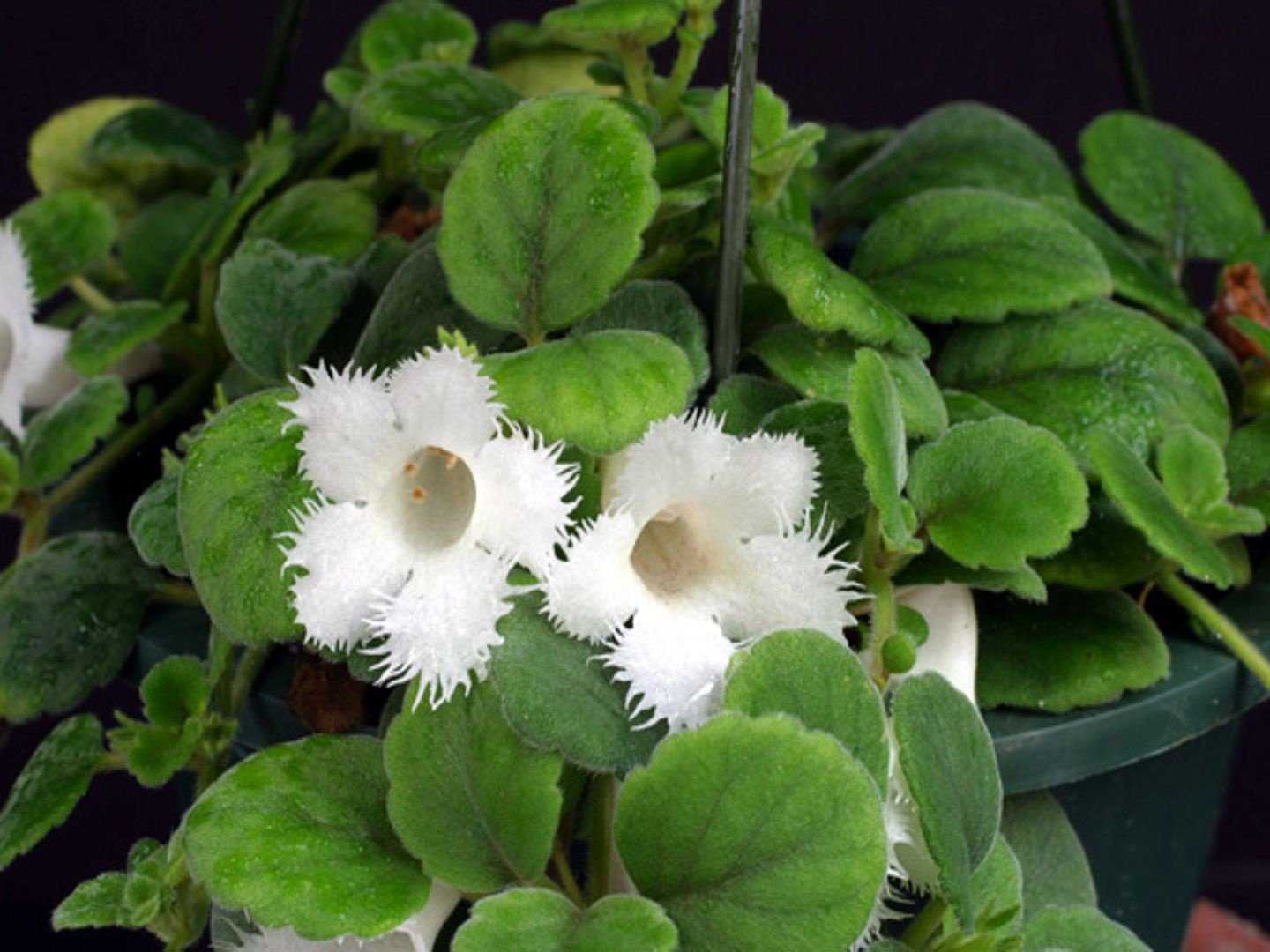 - Эписция гвоздикоцветковая (Episcia dianthiphlora). Ее темно-изумрудная листва украшена белыми цветками с бахромчатым, мелко рассеченным краем, как у гвоздики. Цветки крупнее, чем у предыдущих двух видов – до 4,5 см. На одном растении их может быть одновременно 3-5 штук. Листья небольшие, 4 см в длину, с зубчиками по краям, бархатистые, собраны в красивую розетку. У некоторых сортов имеются красные жилки.