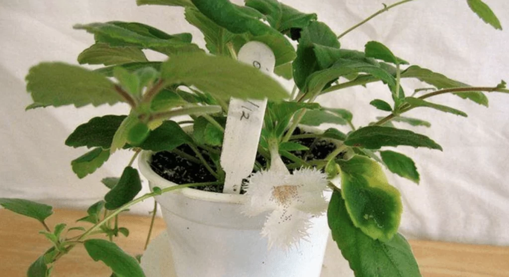 Гибрид, выведенный специально для выращивания в домашних условиях. Для небольшого кустика характерны крупные листья с зазубринами по краям. Цвет листовой пластины — бледно-зеленый. Поверхность покрыта небольшим опушением.