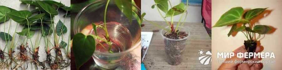 Антуриум способен размножаться черенками с воздушными корнями. После среза такого черенка срез выдерживают два часа на воздухе, обмакивают в древесный уголь и высаживают в грунт. Почва в горшке должна быть лишь слегка увлажненной.