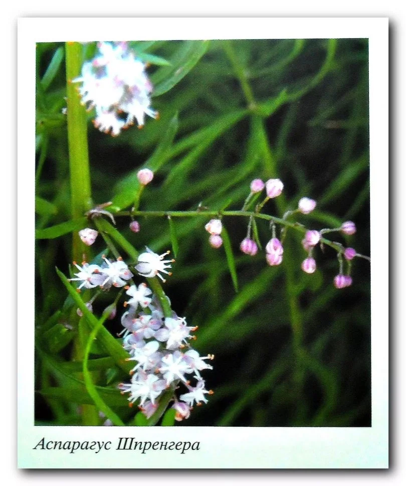 Кистевидный аспарагус (asparagus racemosus). Характеризуется двухметровыми удлиненными побегами, пучковыми филлокладиями линейной формы. Присутствуют цветочные кисти, состоящие из пахучих нежно-розовых цветков.