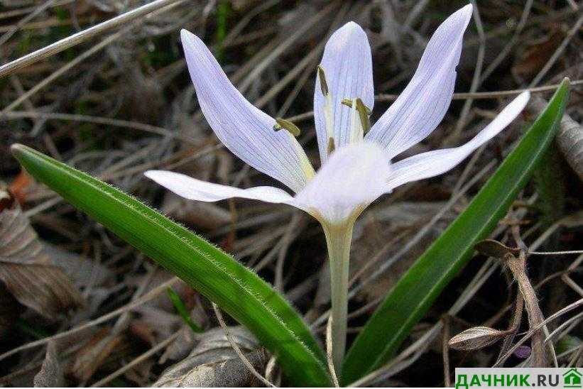 Родина – альпийская местность. Отлично адаптирован к каменистой земле. Каждая луковка образует до 4 белых бутонов с ярко-фиолетовыми полосочками и 3-7 желобовидных листовых пластины с гладеньким краем или с маленькими зубчиками. Расцветает после схода снега.