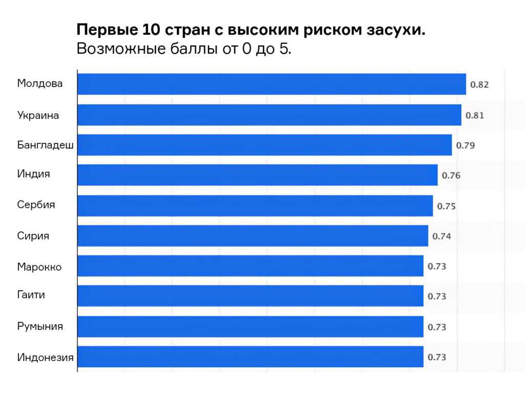 Первые 10 стран с высоким риском засухи. Возможные баллы от 0 до 5. Источник
