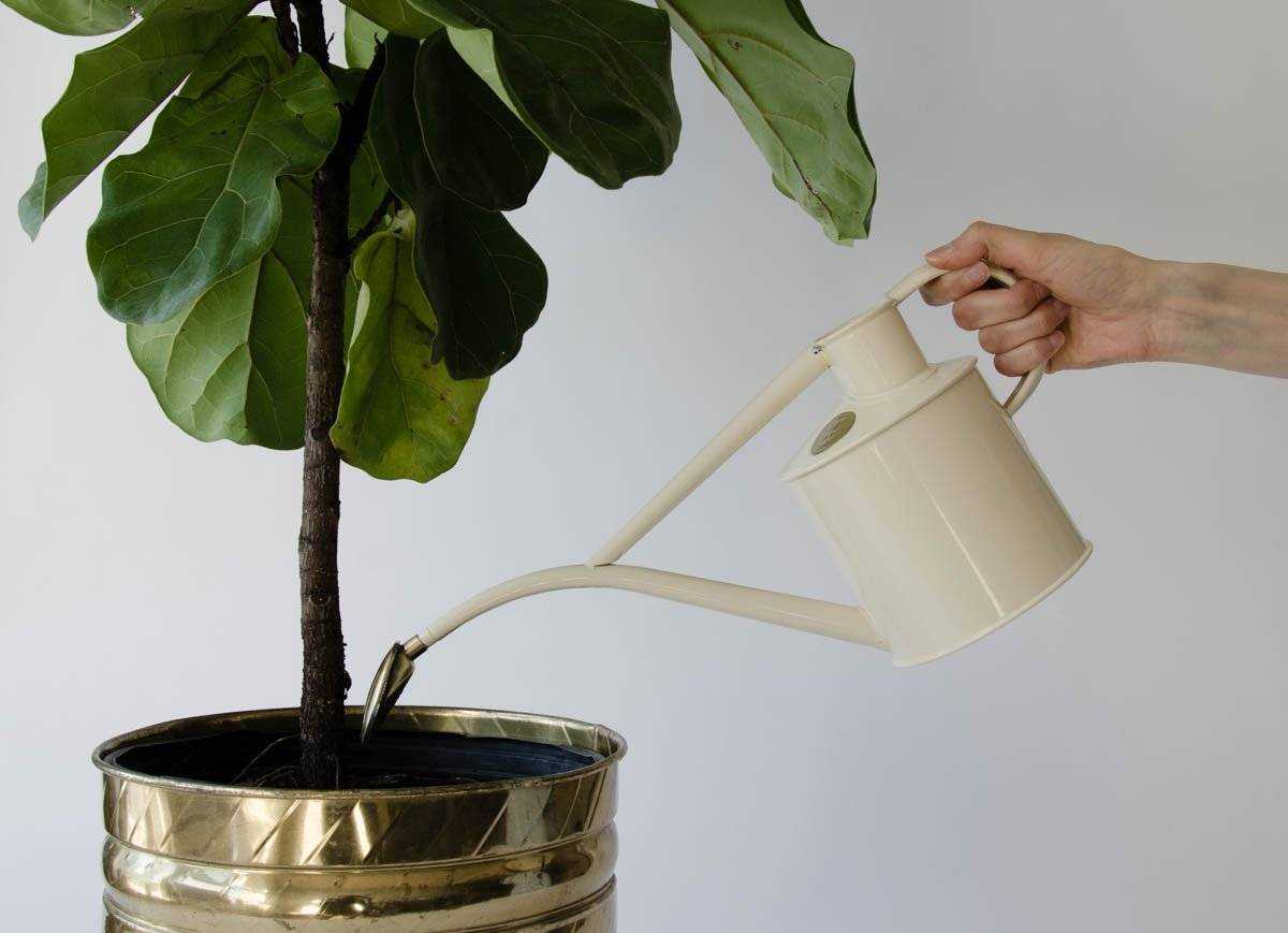 Необходимость полива фикуса определяется по состоянию почвы — она должна слегка просохнуть. Летом рекомендуется поливать фикус лировидный 3 раза в неделю, зимой можно ограничиться поливом 1 раз в неделю. Вода должна покрывать всю поверхность грунта в горшке. Через 30 минут после полива воду, стекшую в поддон, необходимо слить.
