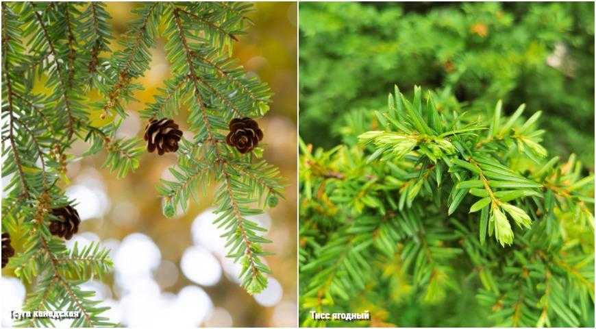 Тсуга (болиголов). Короткие, плоские, темно-зеленые иглы слегка жесткие. На нижней стороне можно увидеть две белые полосы.