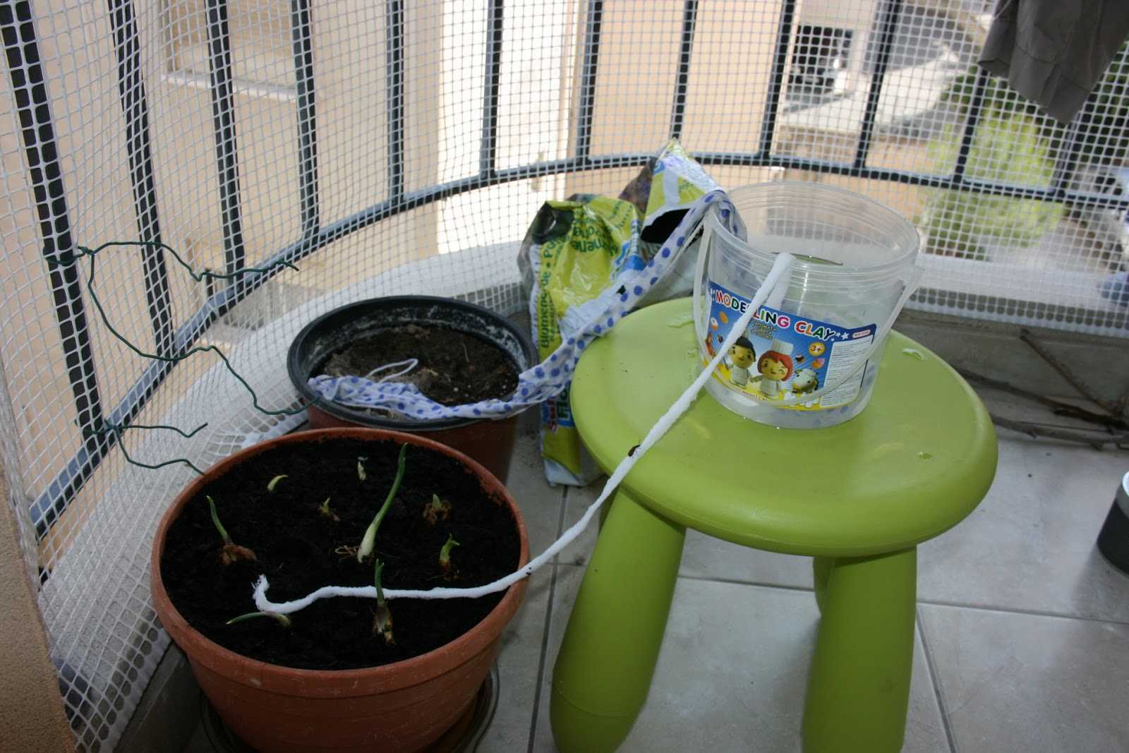 - Способ, аналогичный предыдущему, только вместо капельниц используются натуральные нити или полоски ткани. Отрегулировать подачу влаги в таком случае нет возможности, но считается, что растение само берет то количество воды, в котором нуждается.
