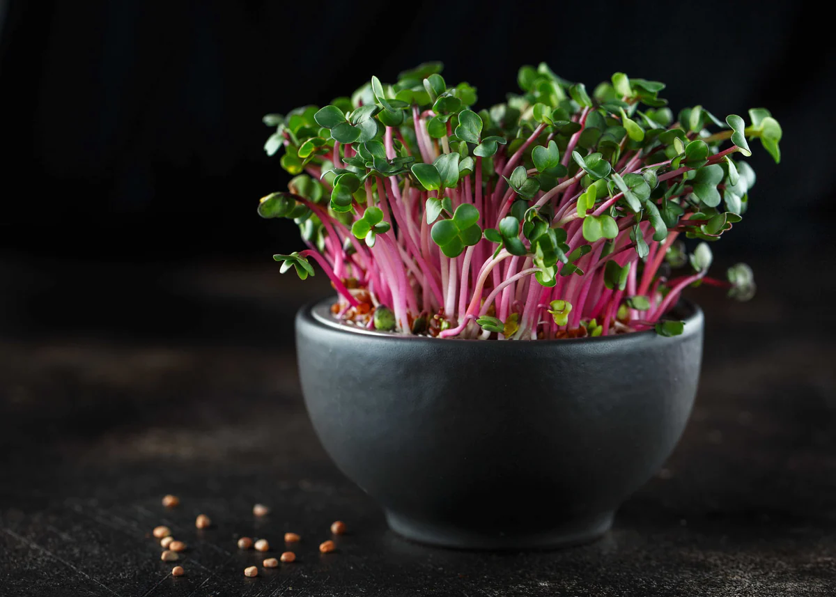 Купите дайкон, краснокочанная капуста, клевер, подсолнечник. Вкусные листочки хорошо подойдут для салатов и украшения супов, бульонов. Большое количество витаминов содержит зелень редиса, для укрепления иммунитета выбирайте свёклу и цветную капусту, а для улучшения обмена веществ подойдут семена пшеницы. Белки, витамины группы В, железо содержит микрогрин гороха, овса, подсолнечника. Для очищения организма выбирайте брокколи