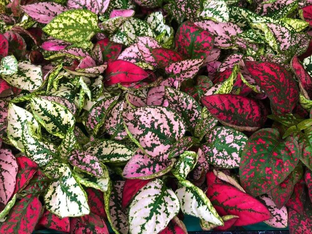 Мягкие листья похожи на листья мяты, оливкового, зеленого, пурпурного цветов с прожилками от белого до яркого розового или бордо.