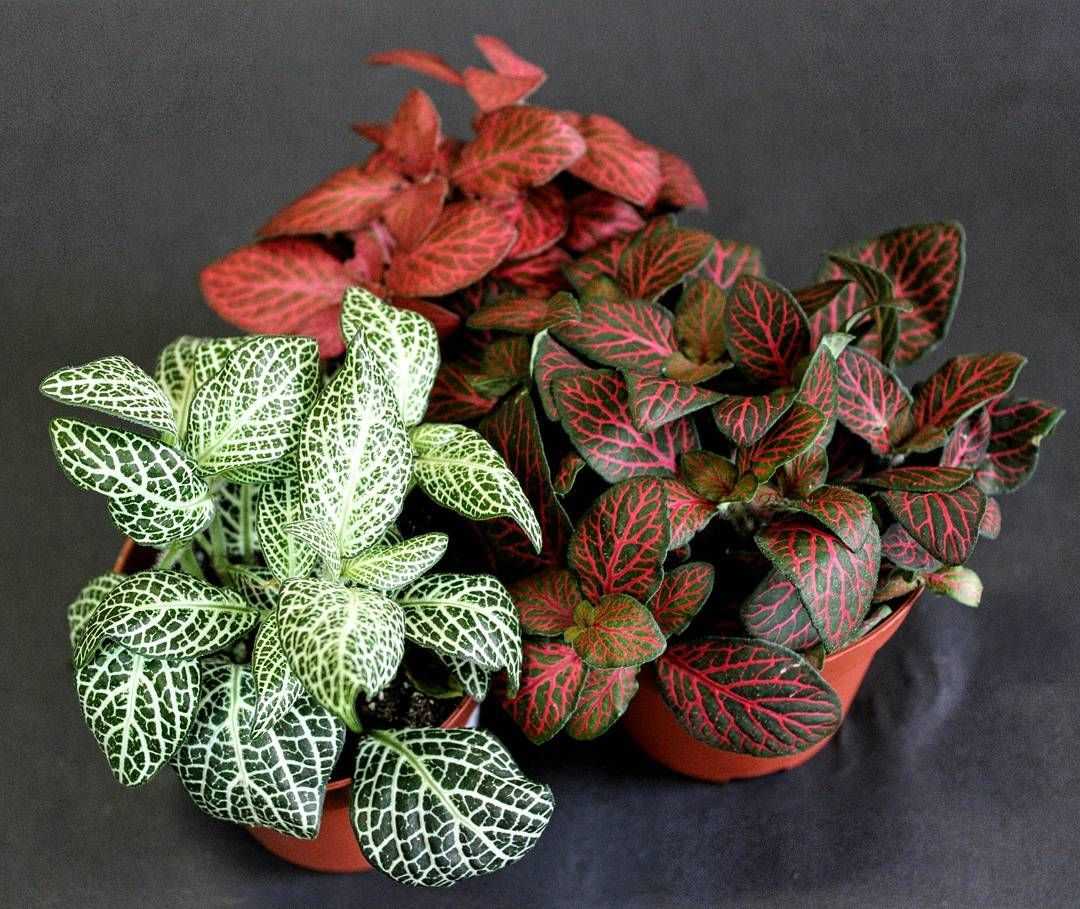 Существует и другие сорта фиттонии, смотрите фото. Разнообразие цветовое, форма листа от округлой с волнистым краем до остро-треугольной с зубчиками, различный окрас листа – жилочное, окантовочное.