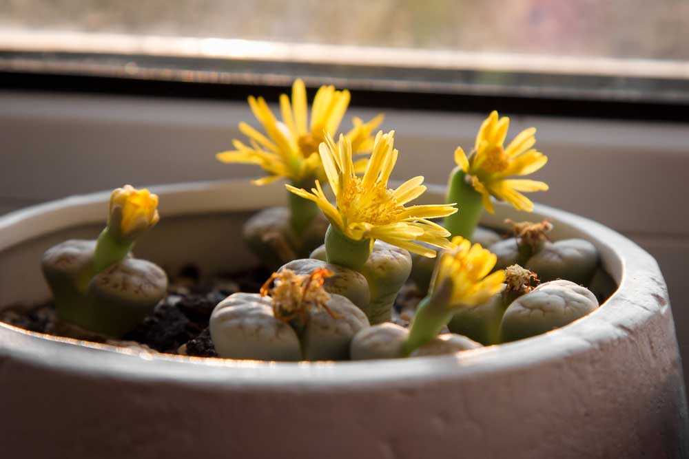 Поскольку это растения коллективные, то высаживать их лучше вместе — поодиночке они начинают чахнуть. Цвести литопсы начинают на 3-5 год, происходит это обычно не раньше середины августа.