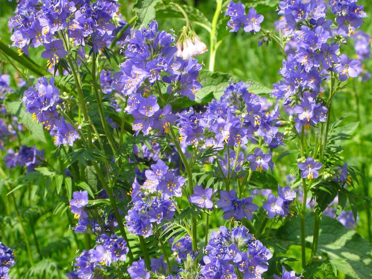 Синюха голубая (или полемониум) — это многолетнее растение с мощными ползучими корнями, высоким стеблем (достигает 120 см) и большими метельчатыми соцветиями.