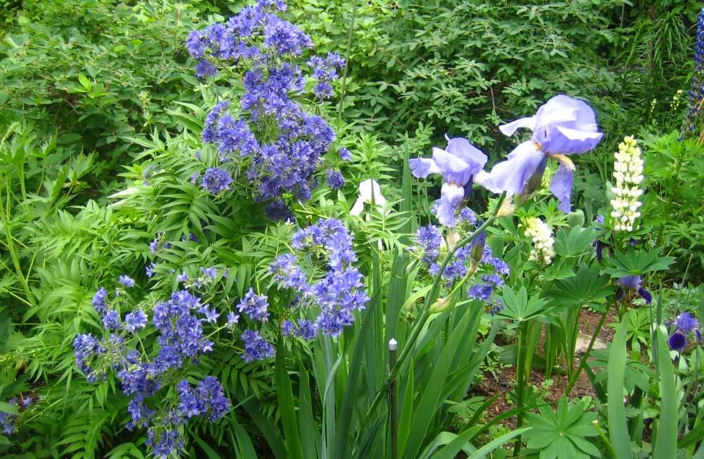 Синюха многолистная имеет лавандово-синие цветки, распускающие в августе. Высота 80 см. Переносит засуху и отлично смотрится с пионами.