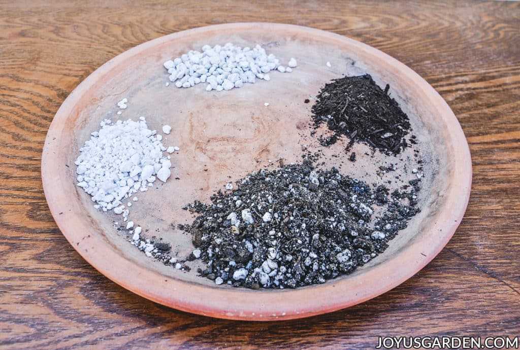The mix I created was roughly 1/2 potting soil and 1/2 of a mixture of pumice and perlite. I prefer to use pumice only because it’s chunkier and has less dust and I’m trying to use the perlite up.